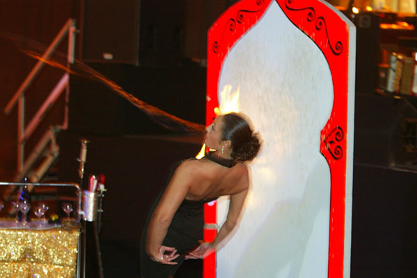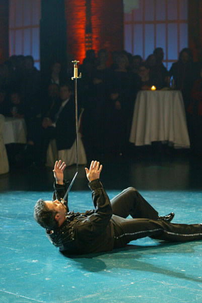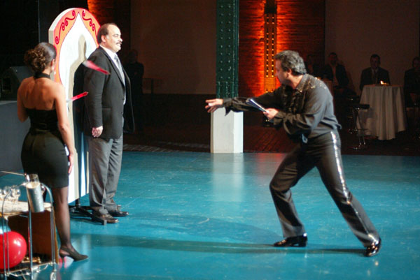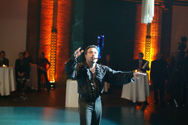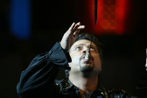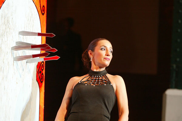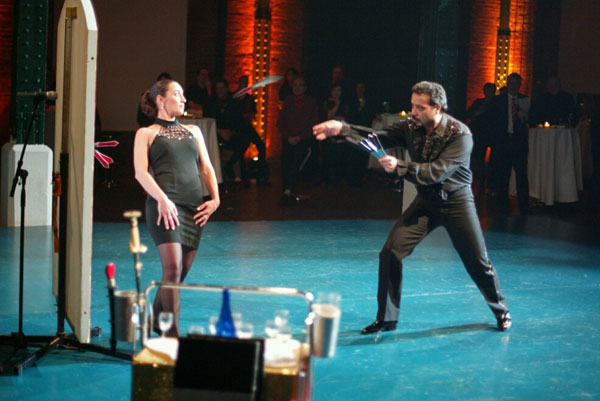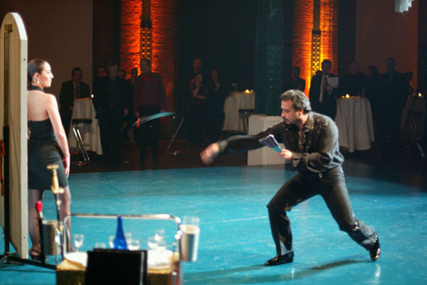 Er präsentiert eine einzigartige Säbelbalance Er balanciert Gläser auf Messerklingen In nur 6 Sekunden wirft er 10 Messer auf seine Assistentin